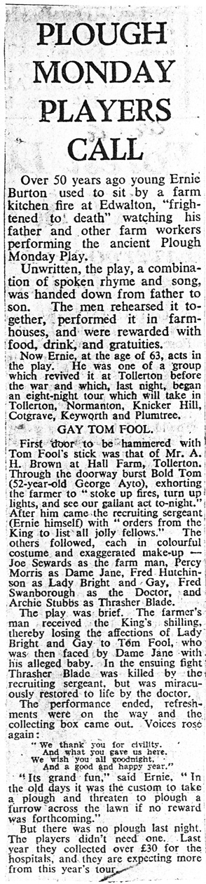 PLOUGH MONDAY PLAYERS CALL [Tollerton, Notts.]